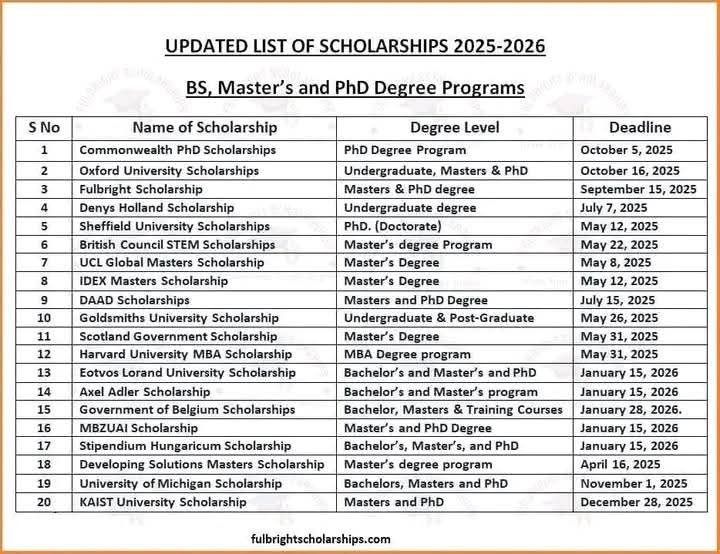 🔴🔴 List of Scholarships in 2025-2026 For International Students | Apply Online Are you an international student searching for scholarships available in 2025-2026? The list of partial and fully-funded scholarships for international students and the compilation of scholarships for 2025 are provided here. 1 Commonwealth PhD Scholarships 2 Oxford University Scholarships 3 Fulbright Scholarship 4 Denys Holland Scholarship 5 Sheffield University Scholarships 6 British Council STEM Scholarships 7 UCL Global Masters Scholarship 8 IDEX Masters Scholarship 9 DAAD Scholarships 10 Goldsmiths University Scholarship 11 Scotland Government Scholarship 12 Harvard University MBA Scholarship 13 Eotvos Lorand University Scholarship 14 Axel Adler Scholarship 15 Government of Belgium Scholarships 16 MBZUAI Scholarship 17 Stipendium Hungaricum Scholarship 18 Developing Solutions Masters Scholarship 19 University of Michigan Scholarship 20 KAIST University Scholarship For more details, click on the link below: https://fulbrightscholarships.com/list-of-scholarships/ Copied Enseignement Supérieur-Higher Education